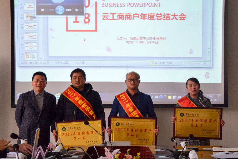 2017年,在全体商户的共同努力下,本着一切为师生服务的宗旨,学校后勤与商户围绕提升保障力度、优化服务两个方面,激流勇进,圆满完成了2017年的后勤工作任务,提高了学校的知名度,提升了师生的满意度。1月16日,ky开元集团常务副校长邹利斌、后勤运营中心主任黄翠芬及商户代表齐聚行政楼一楼会议室举行2018云工商商户年度总结大会。