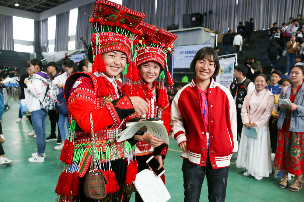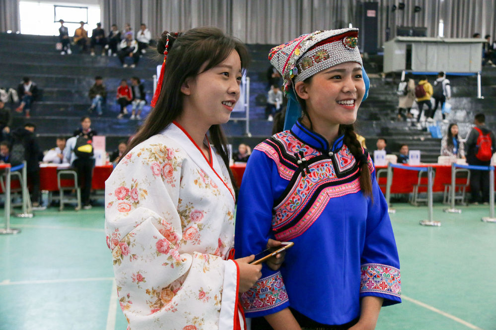 单招第二天,人气持续爆满,人群中,最大的亮点要数那群身着少数民族服装的考生了,花腰傣、彝族、傈僳族、傣族、白族......来自全省各个州市的少数民族考生齐聚云工商。他们的到来,在云工商校园挂起来一阵旋风,也给这次单招考试带来了一抹炫丽的色彩,惊艳了面试考官,也引来了大批同学的围观拍照。