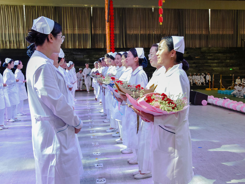 洁白的燕帽象征着圣洁的白衣天使,燃烧的蜡烛象征着“燃烧自己,照亮他人”。授帽仪式是护生成为护士的重要时刻。伴随着“平安夜”的庄严乐曲,护生行半蹲姿礼在老师面前,老师为护生戴上圣洁的燕帽,护生接过蜡烛并点燃紧接着宣读誓言。这一刻她不再是护士生而是一名真真的护士。