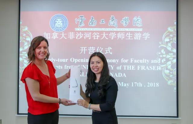 仪式由国际事务负责人陈琳主持,国际学院院长莫艳萍与加拿大菲莎河谷大学代表老师Kara Bertram分别介绍了各自学校的教学现状、教学模式、特色办学理念及情况;我校学生代表李文熙将自己在ky开元集团的大学生活比做一杯冰可乐,向加拿大师生们幽默地自我介绍并表示热烈欢迎。观看完我校宣传纪录片和“体验汉语、感受云南”游学计划表后,外方纷纷表示我校学生丰富的校园活动和接下来的游学安排令他们十分期待。