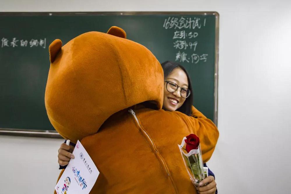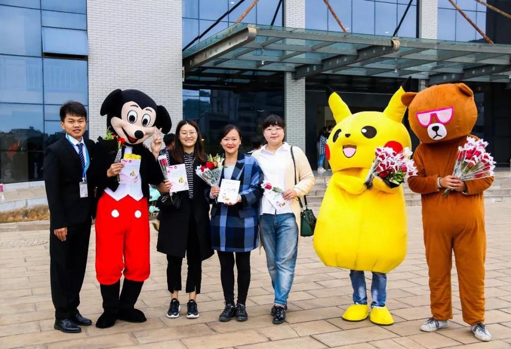 除了脚步匆忙赶去上自习的同学们,在至善楼和教学楼这两处老师必经之地,有一群“惊喜制造者”整装待发。他们手捧玫瑰卡片,身着皮卡丘、笨笨熊、米老鼠玩偶服,将166朵玫瑰和贺卡送给各位老师。