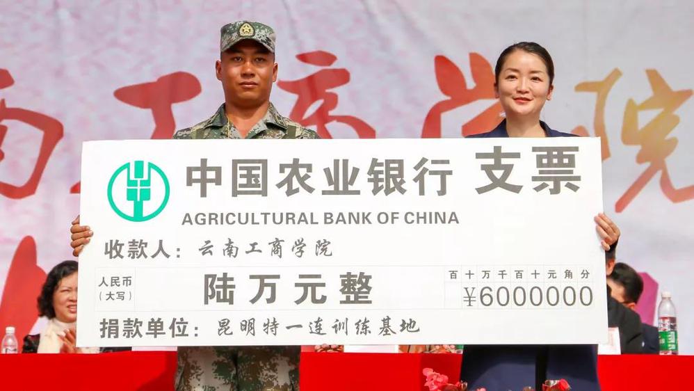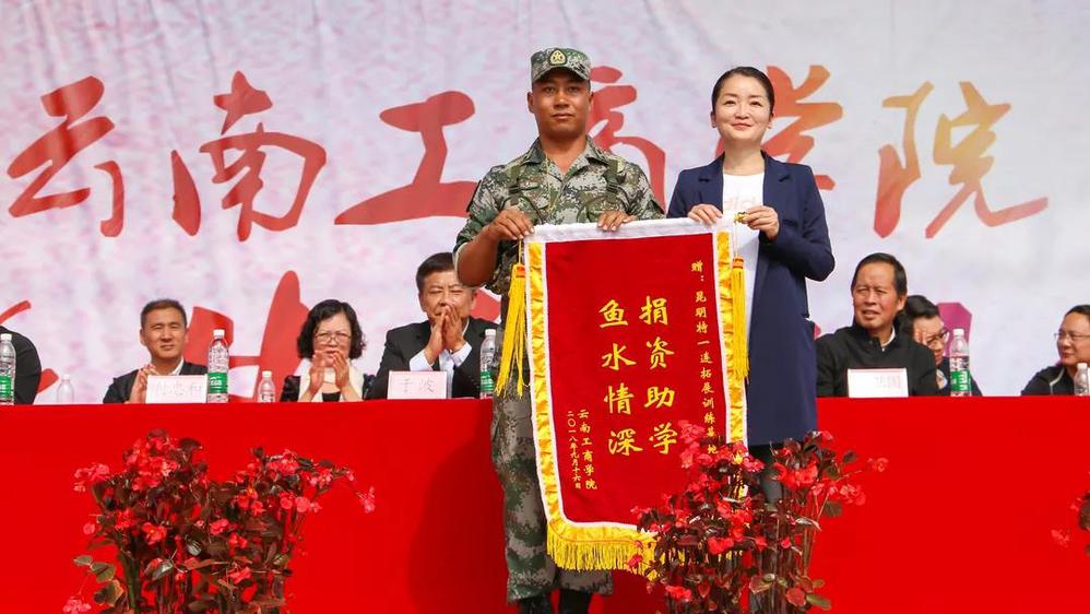 昆明特一连训练基地领导向我校捐赠“特一连”助学基金6万元,李娅副校长向特一连赠送锦旗。