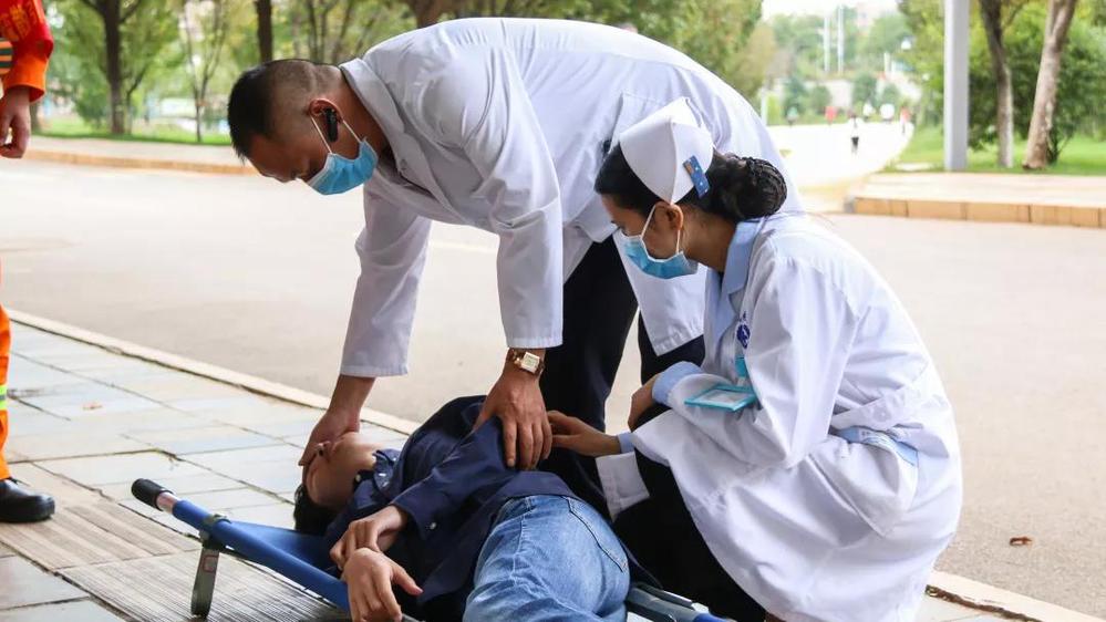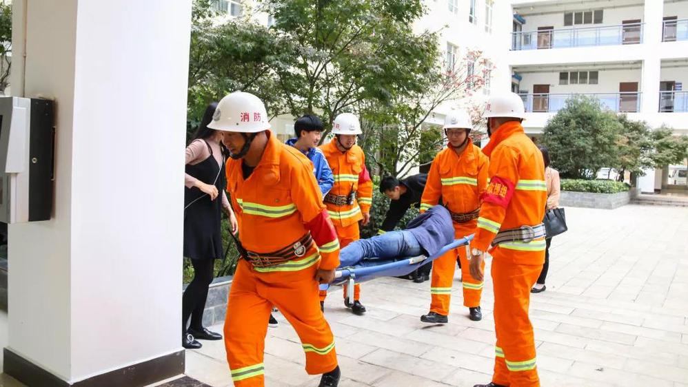 警报响起,致知楼内烟雾弥漫,同学们接到撤离命令后,用湿毛巾捂住口鼻,在安全员引导下,弯腰贴着墙面,从致知楼有序疏散,消防员将(伤员)抬出进行救治,其他同学安全撤离到足球场,整场演练井井有条。