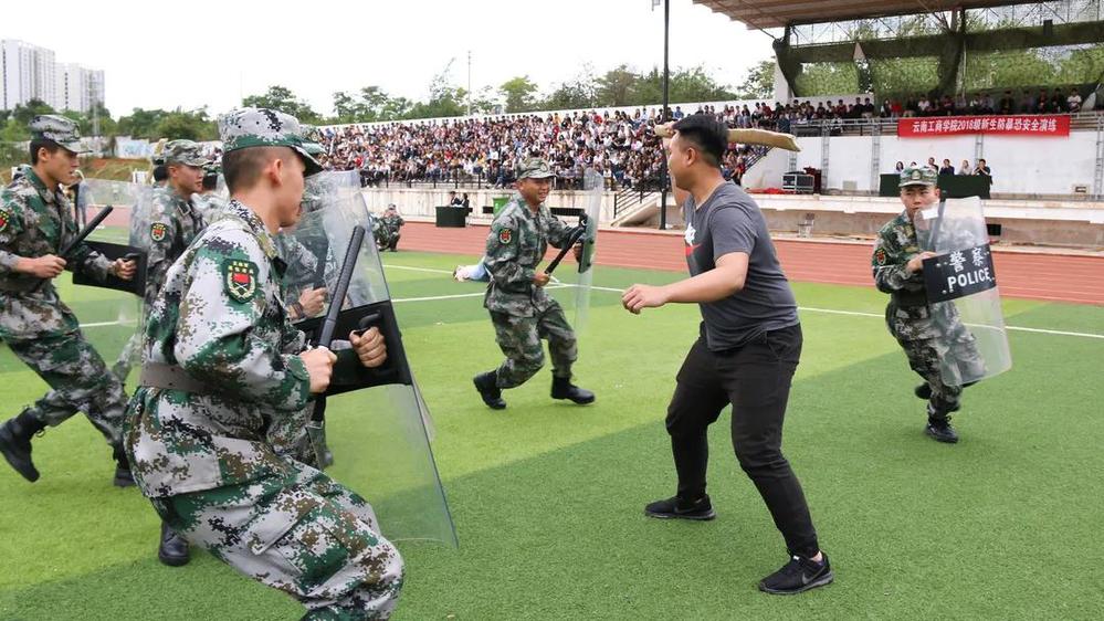 接下来的防暴恐演练由学校退伍老兵全程参演,由真实的案例改编而来,学校保卫处、各二级学院学生科、校医院等多部门联合参与演练。
