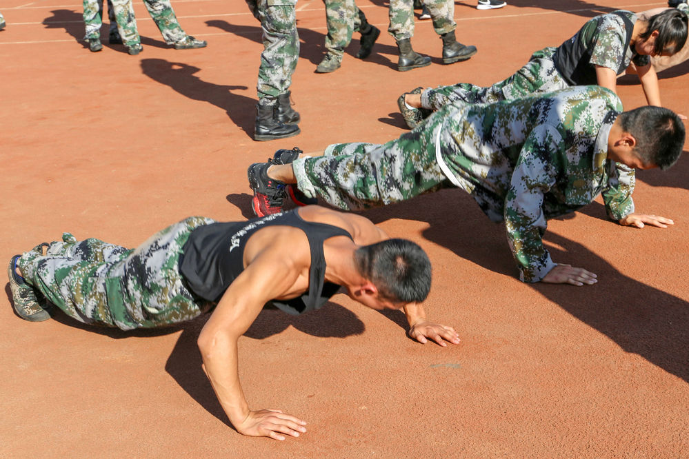 第二项:仰卧起坐、俯卧撑测试。在数字声的伴随中,一个个身影起起伏伏,每个人都竭尽全力去拼,好像害怕丝毫的懈怠就会被终止选拔。
