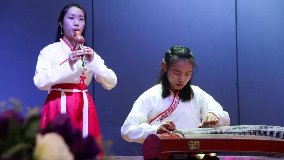 我校色锦瑟民乐团的学子,以清脆悦耳的古筝、委婉动听的葫芦丝,演奏了《青花瓷》,配着唯美的汉服,彰显了中华民族传统民乐和汉服的古典美。