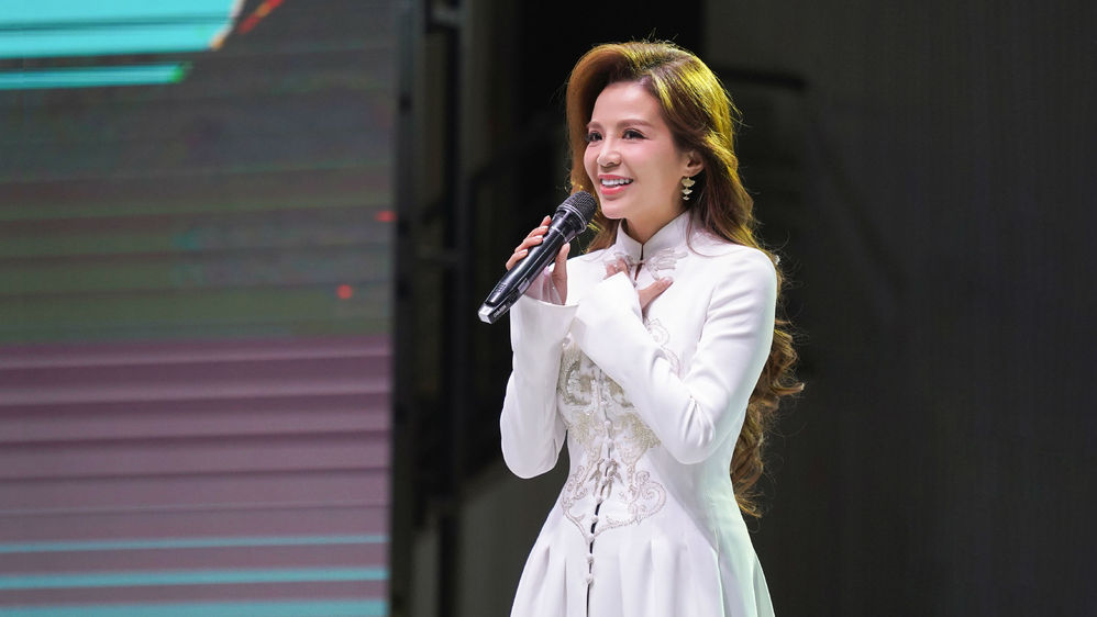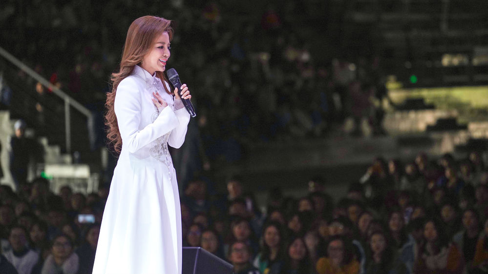 陈博境主任刚用俏皮的话语介绍完朱迅老师后,她便着一袭白裙从幕后款款走来,近了,更近了,所有人屏住呼吸,怕呼吸声过重惊扰了这份美。