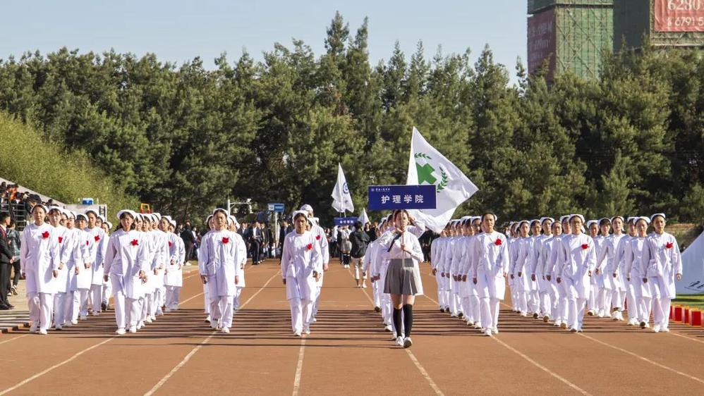 那一抹白色,是护理学院。身躯里蕴含着强大的力量与南丁格尔的精神相结合。不输他人的气势在提醒着我们:护理学院,不能小看。