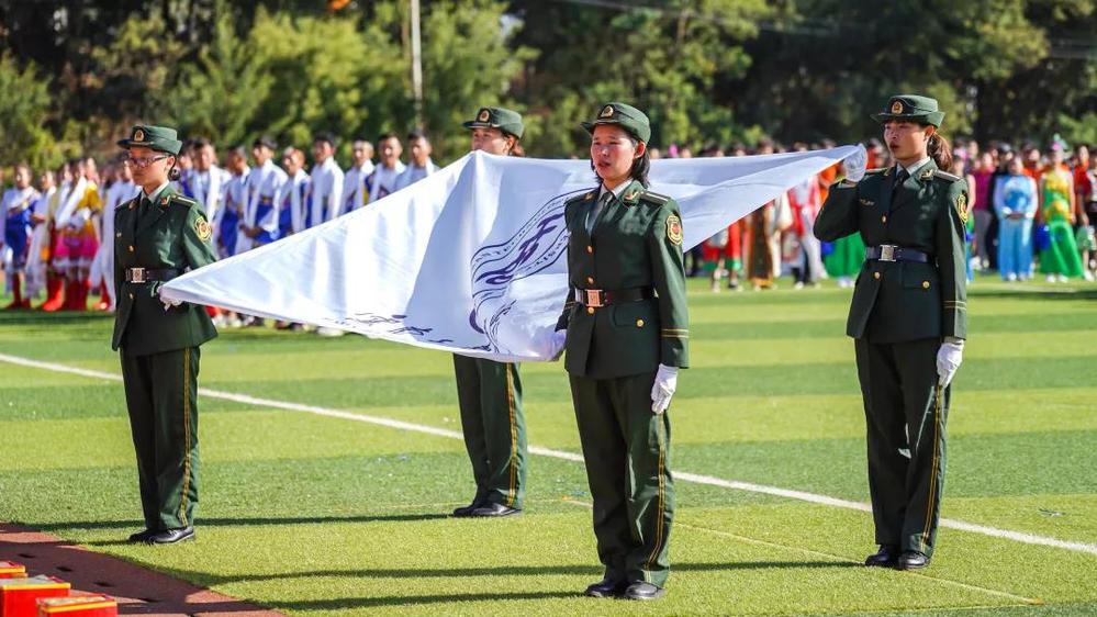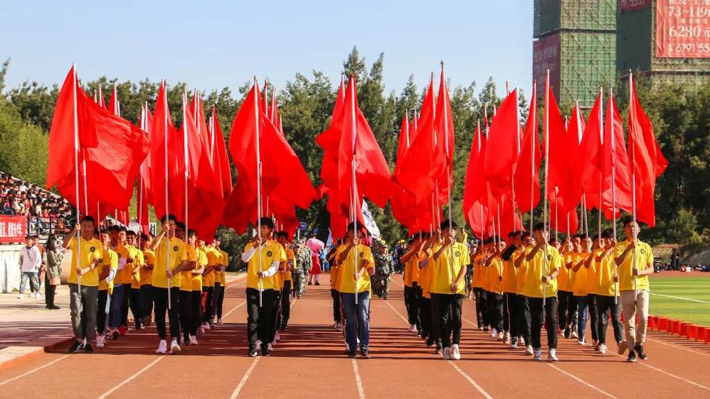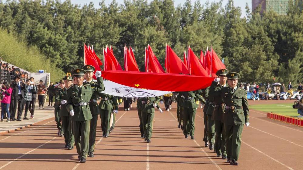 在激昂的乐曲声中,校旗队、红旗队、刀旗队以精神饱满的面貌,高举迎风飘扬的校旗、国旗,迈着坚实有力的步伐进场,成功吸引眼球。