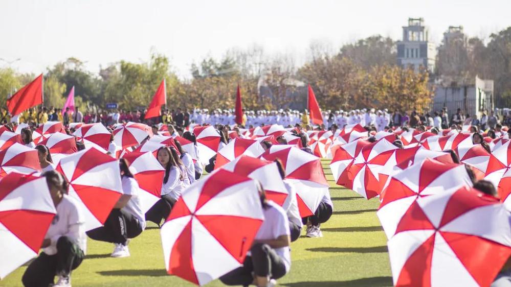 红旗方阵气势如虹,呈V字型鱼贯而出,表演方阵展示开始了!红白相间的条纹伞此起彼伏的撑开旋转,小小的伞汇集成拱形的桥,就像一个一个的家组成了一个团结的国,音乐恢弘大气,寓意深远绵长。