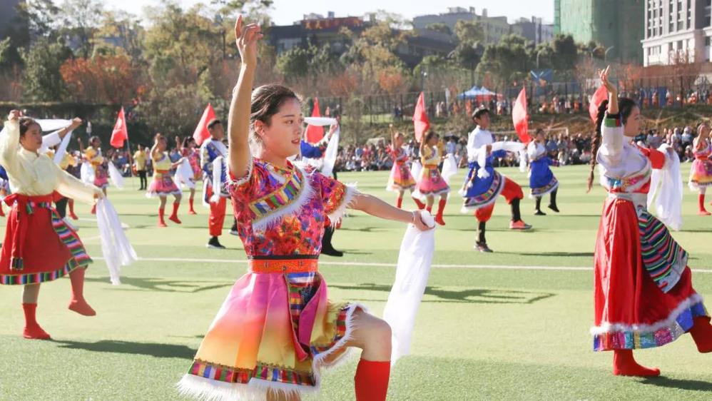 民族大团结音乐响起了,舞者们手拿洁白的哈达,仿佛置身于一望无际的大草原,与各民族少男少女围成圈群舞。之后所有演员共同合唱,五颜六色的裙摆飞舞,五十六个民族团结一心。