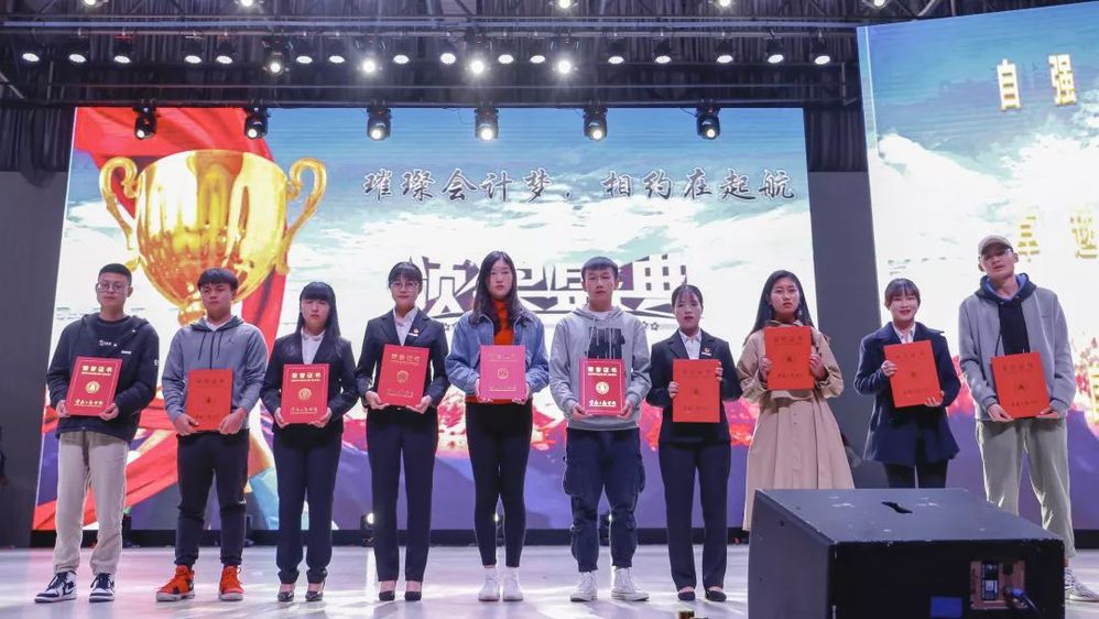 颁奖典礼上,各位领导分别为会计学院辩论赛、迎新杯篮球赛、合唱比赛、运动会、数字键盘录入大赛、点钞大赛、分录大赛、2018年云南省技能大赛个人扑克比赛、2018年云南省会计技能大赛、网中网决策大赛、科云杯财会职业能力大赛、中华会计网校财会大赛等比赛中获奖的同学颁奖。