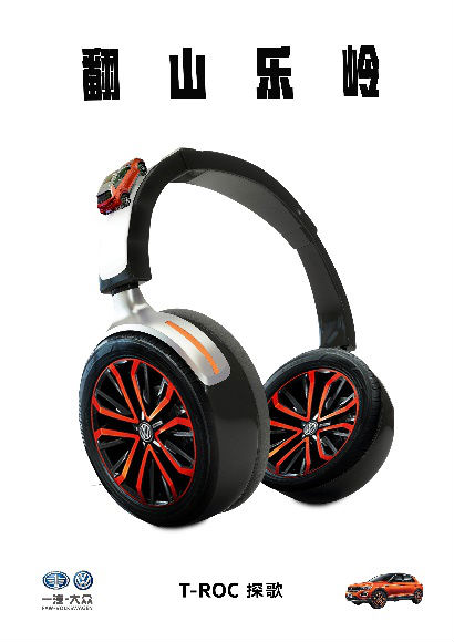 T-ROC探歌系列表达的是,在探险的路途中依旧有歌声的陪伴。探险,路定不平坦;探险,路程会有些许孤单。而探歌系列将两者问题一并解决,探歌的越野性能与极致音质让你的旅途不再孤单。将耳麦变成标识性极强的探歌橙色系列的轮胎,意为,极致音乐,走哪儿听哪儿。车在耳机上爬坡,表达出探歌的越野性能。海报主题清晰,主抓T-ROC的两大性能,将其创意结合,视觉冲击力度较大,趣味而不失看点。