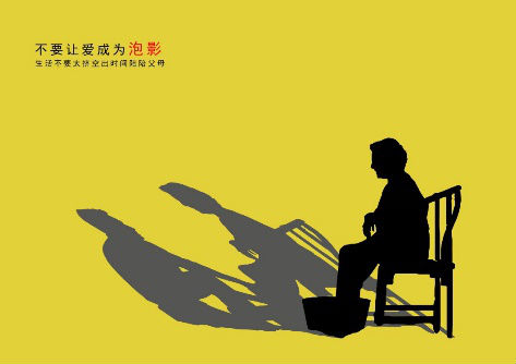 父母渐渐老去,儿女逐渐繁忙,空出时间多陪陪父母。海报设计的初衷是警示大家时间过得很快,和父母在一起的时光也在慢慢的消逝,也许当你回神来时这一切就只能是泡影了。