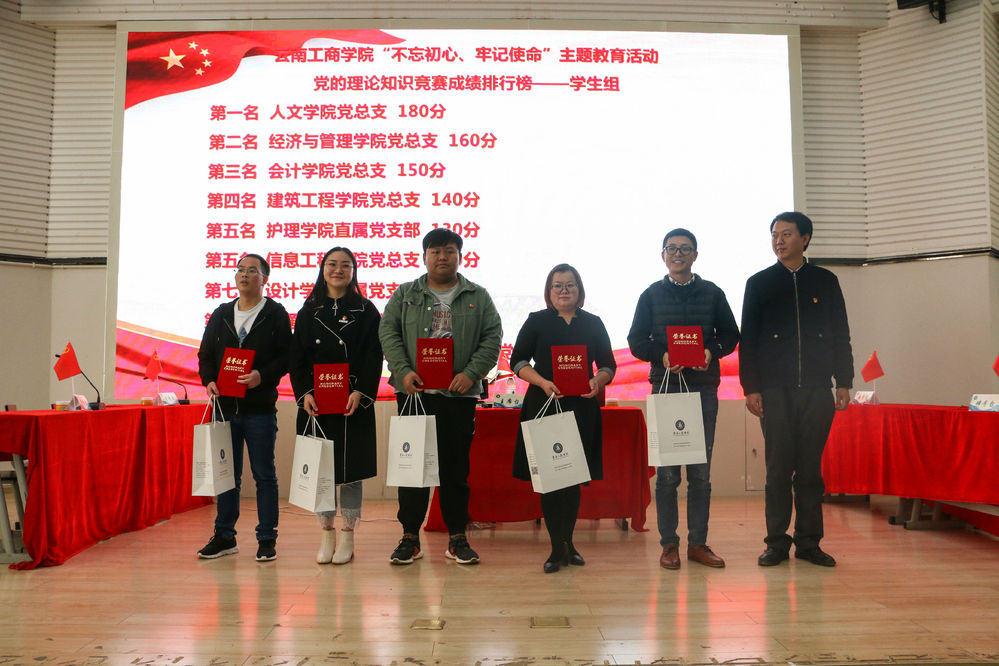 紧接着是学生组的比赛,赛场上,各参赛队选手沉着冷静、配合默契,反应迅速。正答率极高,难分伯仲,将比赛一次次推向高潮,竞赛进行得如火如荼,层出不穷的题目更是让参赛人员绞尽脑汁。最后人文学院党总支学生代表队夺冠。同学们的表现不仅展示了自己的党员风采,也体现了云工商学子扎实的知识储备,精诚合作的团队精神和良好的精神面貌。