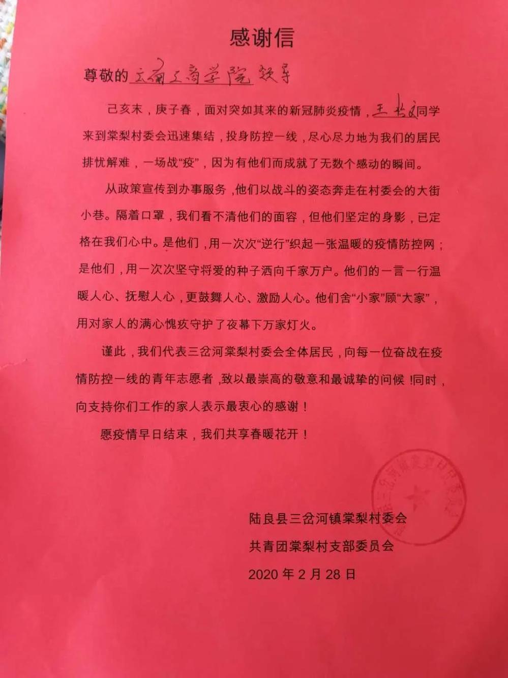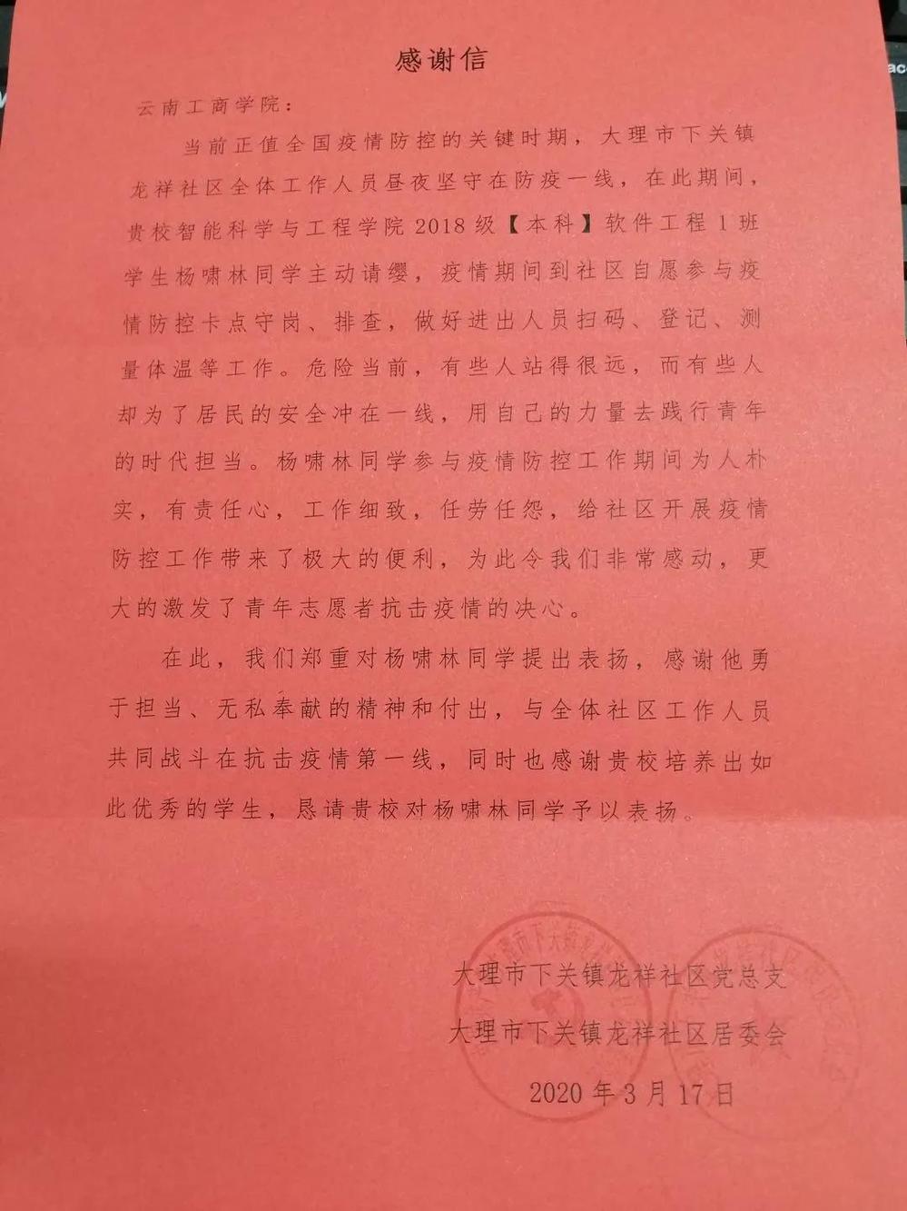 近日,学校收到了来自祖国各地的一封封感谢信,信中对在疫情期间积极参与疫情防控工作的ky开元集团学子表达了感谢,并给与了高度评价。