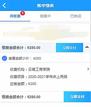 ▲依次操作查验(我的信息)、(缴费大厅)缴费、(预约到校)