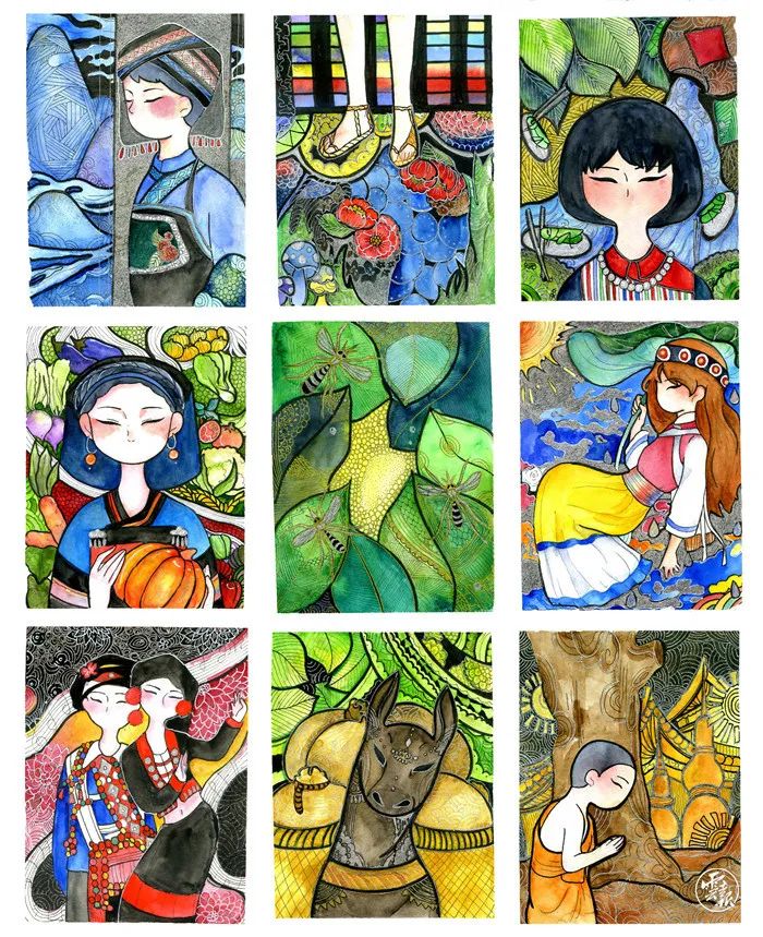 历经一整年的时间,几易其稿。云南十八怪系列作品终于创作完成。在老师的指导下,何茜又把画作进行了进一步的深化设计,并完成了系列云南旅游纪念品的文创设计。