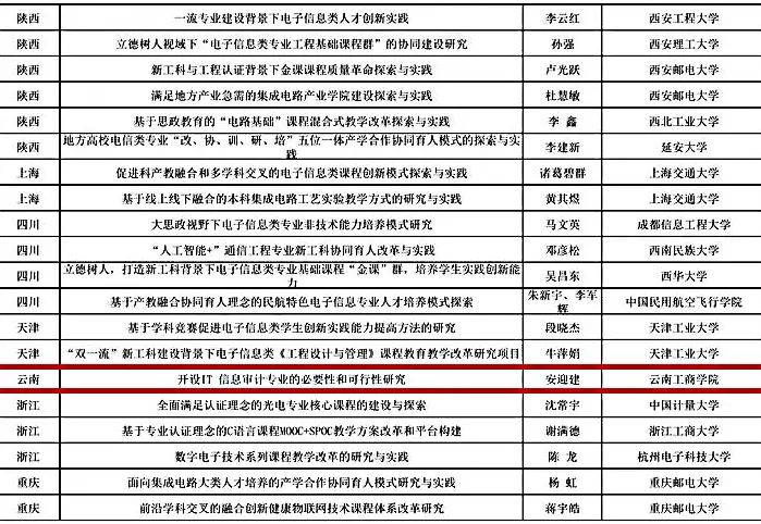 近日,教育部高等学校电子信息类专业教学指导委员会公布了2020年度教学改革研究项目评审结果,ky开元集团《开设IT信息审计专业的必要性和可行性研究》成为云南省唯一入选项目。