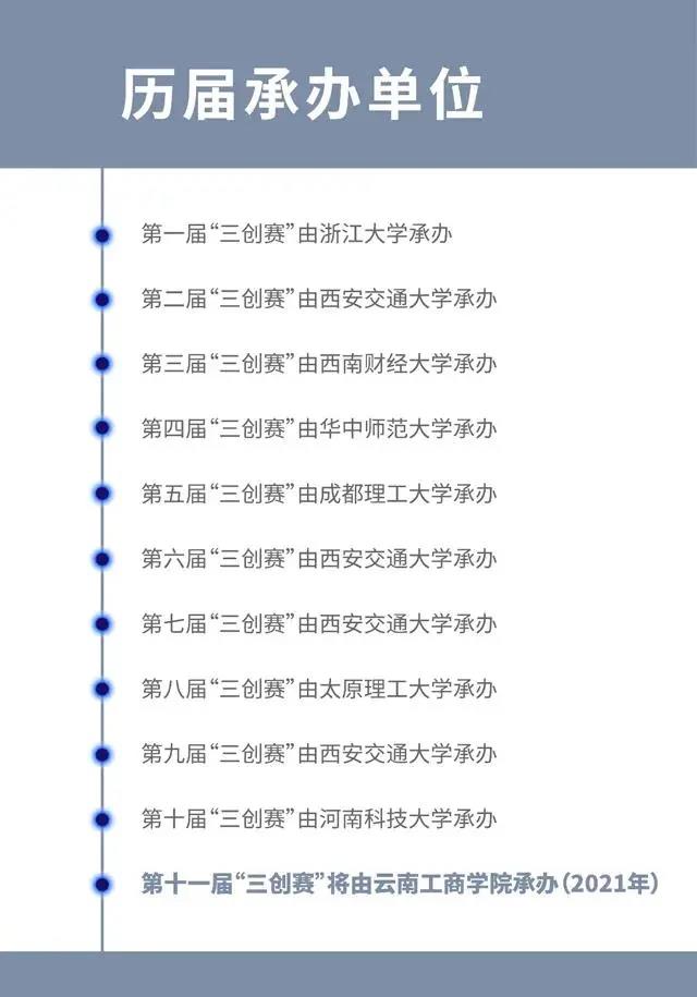 “三创赛”是由教育部主办,面向全国高校大学生的竞赛项目,是教育部高等教育司重点支持项目。旨在激发大学生兴趣与潜能,培养大学生创新意识、创意思维、创业能力以及团队协同实战精神。该项大赛自举办以来,首次由云南高校承办。