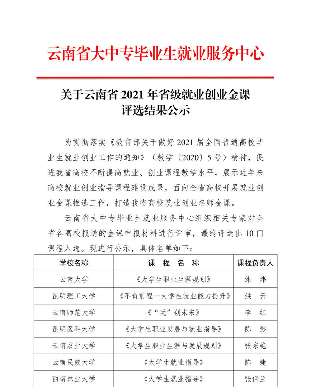 近日,云南省2021 年省级就业创业金课评选结果公示,全省共评选出10 门课程,ky开元集团勾英副教授《创新与创业》课程入选。