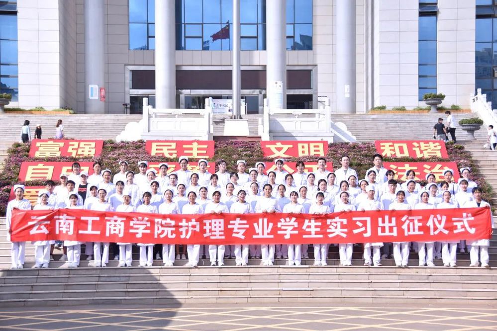太阳初升,一辆辆大巴车拉起长龙,突然闯进云工商校园,伴随汽车长龙进场,鲜艳的条幅点燃了宁静的校园,来自大健康学院的准护士们正式登场啦。