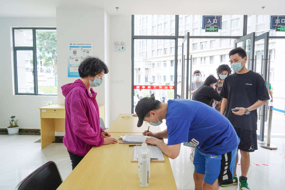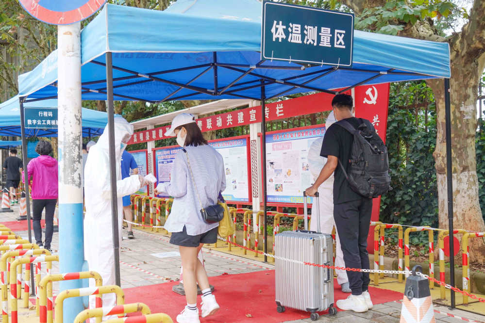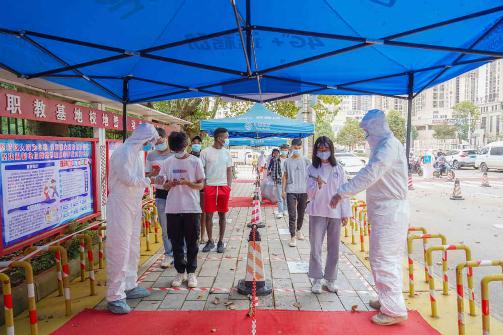 校门口接待流程演练中,分别进行了体温异常,反复检测后恢复正常;体温异常,反复检查后仍然高烧;不符合返校条件人员(黄码、红码、未持有48小时核酸检测报告);强行闯入四个场景的演练。