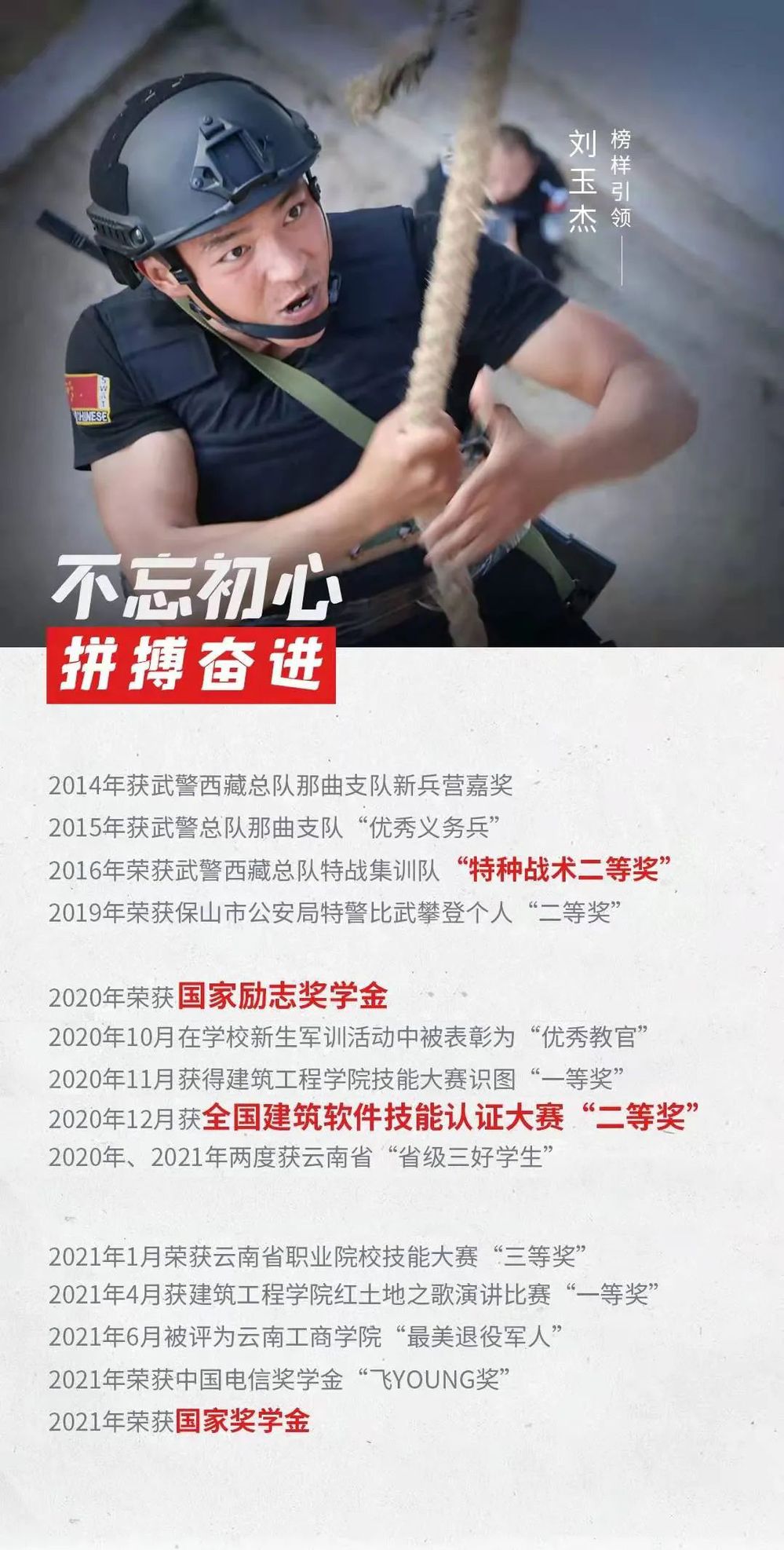 不仅如此,刘玉杰还积极利用课余时间勤工助学赚取生活费,以减轻家庭负担;假期参加嵩明县人民武装部新兵役前集训并担任班长,用自身所学回报社会;疫情来临时主动捐款,化身志愿者投入到抗疫行动中;此外还积极宣传疫情防控知识,为防疫工作贡献力量......