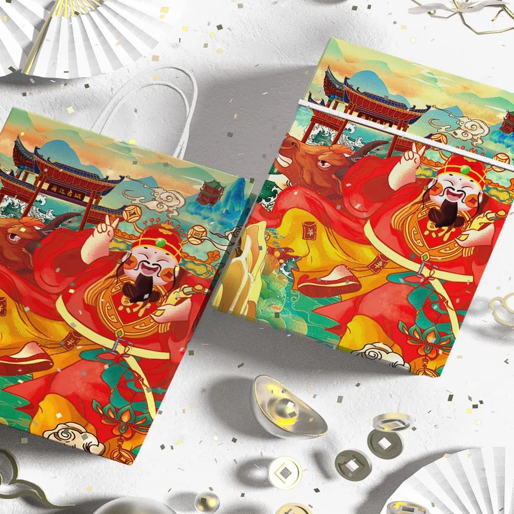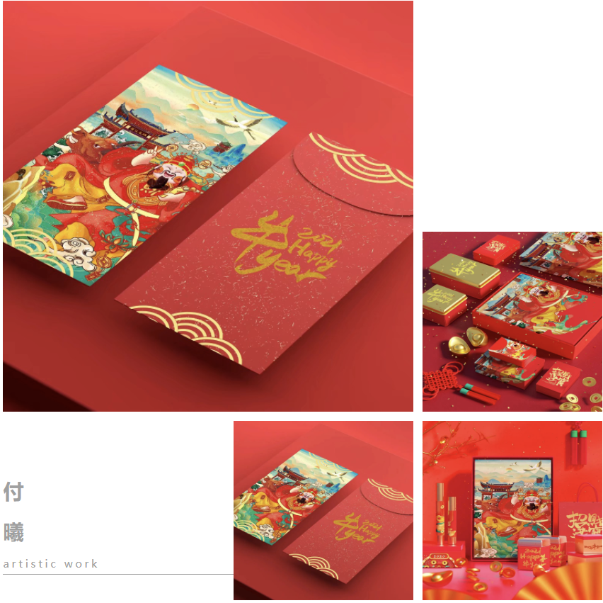 2021年是中国农历牛年。新年贺词一般用中文表达,很少的人也会用英语,但这是第一次在问候中同时使用中文和英语。原因是英语中的New发音和汉语中牛的发音完全相同。红色信封的翻盖上画着吉祥云,这是中国传统的吉祥符号。其次,把漫画风格运用到中国新年衍生产品上是相当前卫的,将传统文化融入大众,实现文化嫁接,将传统文化带入新生活。