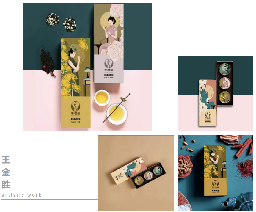 王金胜:本次设计灵感来源于旗袍,旗袍被誉为中国国粹和女性国服。其花样种类繁多,不同款式的旗袍代表着不同的寓意。这次设计是以花茶为主,在旗袍上运用了相应的花朵素材,更加显现出女性的柔美,使得画面更加丰富却不失平衡。将具有代表性的中国特色旗袍元素和花茶进行组合用插画表现,使得花茶包装能更加清晰明了体现中国特色的茶文化。