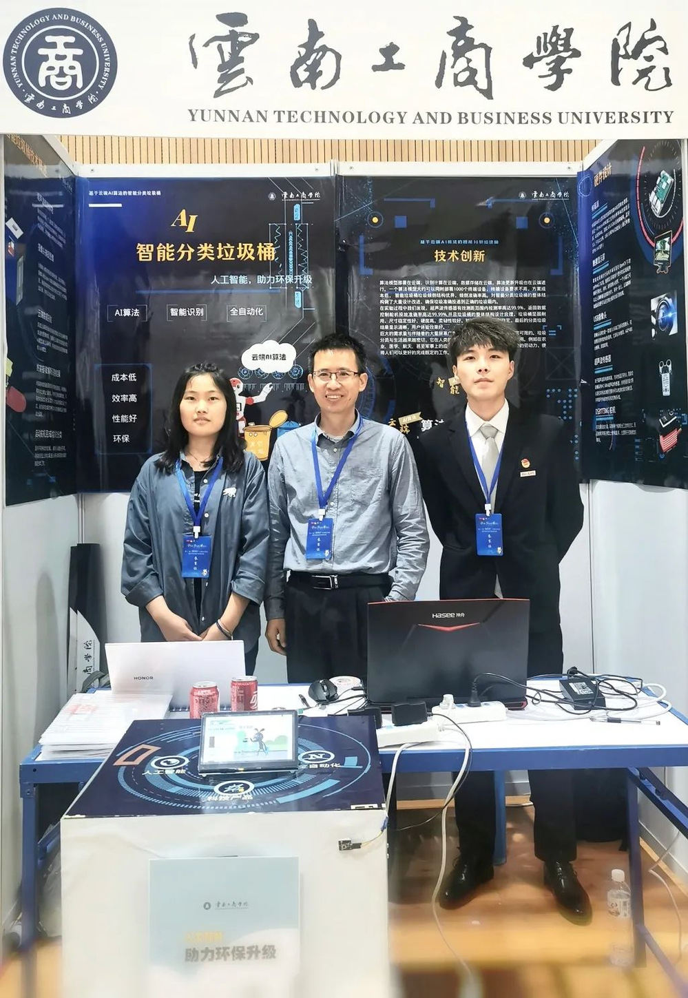 智能分类垃圾桶运用AI技术来实现垃圾的智能检测、识别与投放。设备由超声波传感器、显示屏、树莓派、摄像头、舵机等组成结构,采用云端部署的方式实现算法,能够更好地实现产品的改进、维护、升级等功能。可应用于农业、医学、航天、军事等各个领域。
