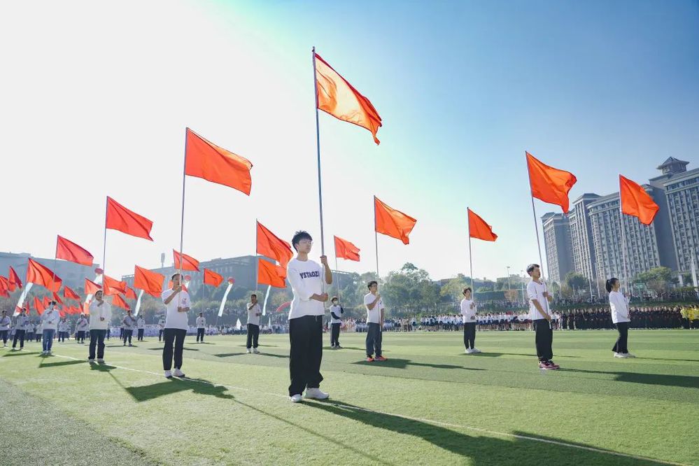 庄严的国歌奏响,全体肃立。大家在心中,一遍遍诉说着对祖国的美好祝愿。学校校长周刚向刻苦训练、积极备战的全体运动员、教练员表示问候,向全体工作人员表达了感谢。他说:“生如夏花向朝阳,不负韶华绽锋芒。希望青年学子拼搏奋进、超越自我,用智慧、用技能、用知识来征服困难,做有理想、有道德、有文化、有纪律的四有青年,在实现中华民族伟大复兴的中国梦的征途上,绽放属于自己的光芒。