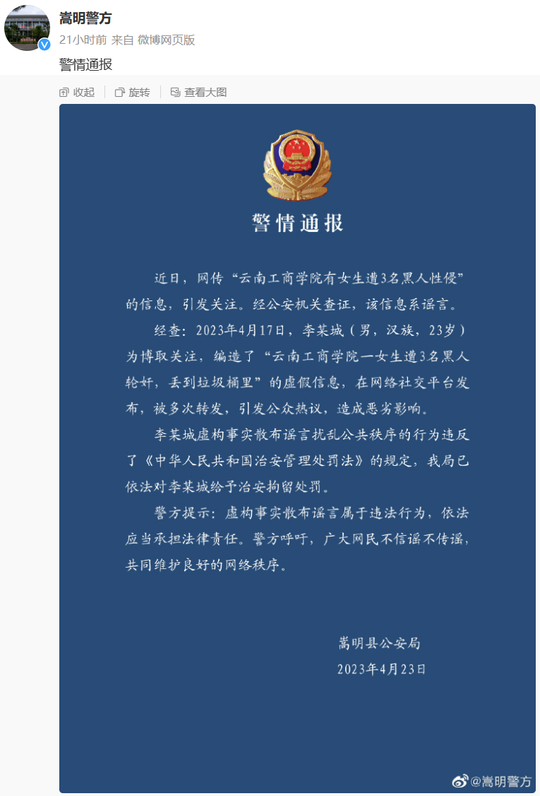 23日,嵩明警方发布警情通报,该信息系谣言,系李某城编造。已依法对李某城给予治安拘留处罚。全文如下——