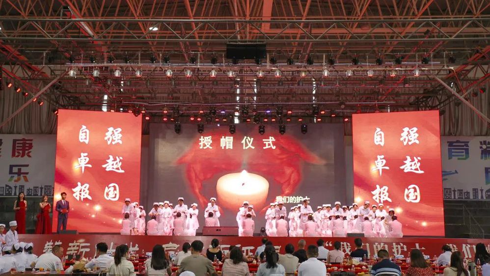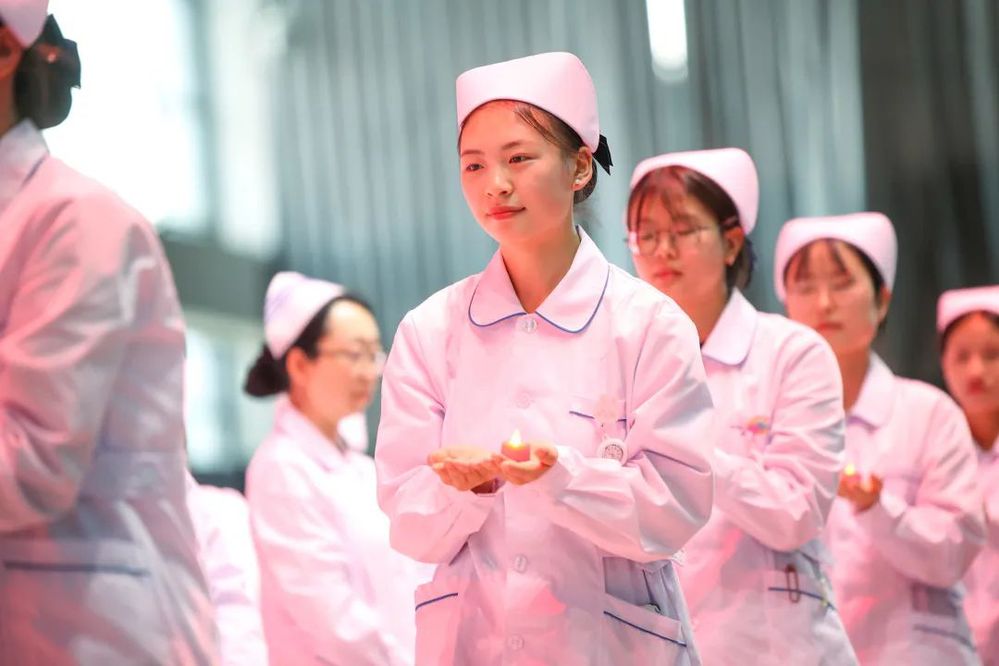 护理专业的学子有序上台,护理学前辈一一为同学们们戴上了圣洁的燕帽,点燃了代表“提灯女神之光”的烛灯,象征着崇高理想得以光荣传承。
