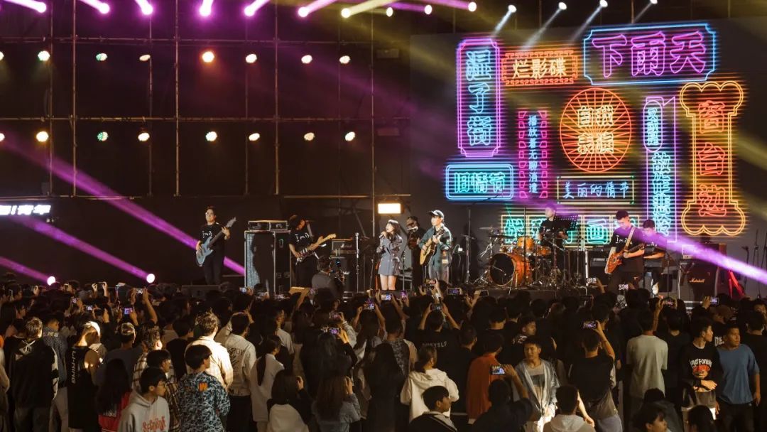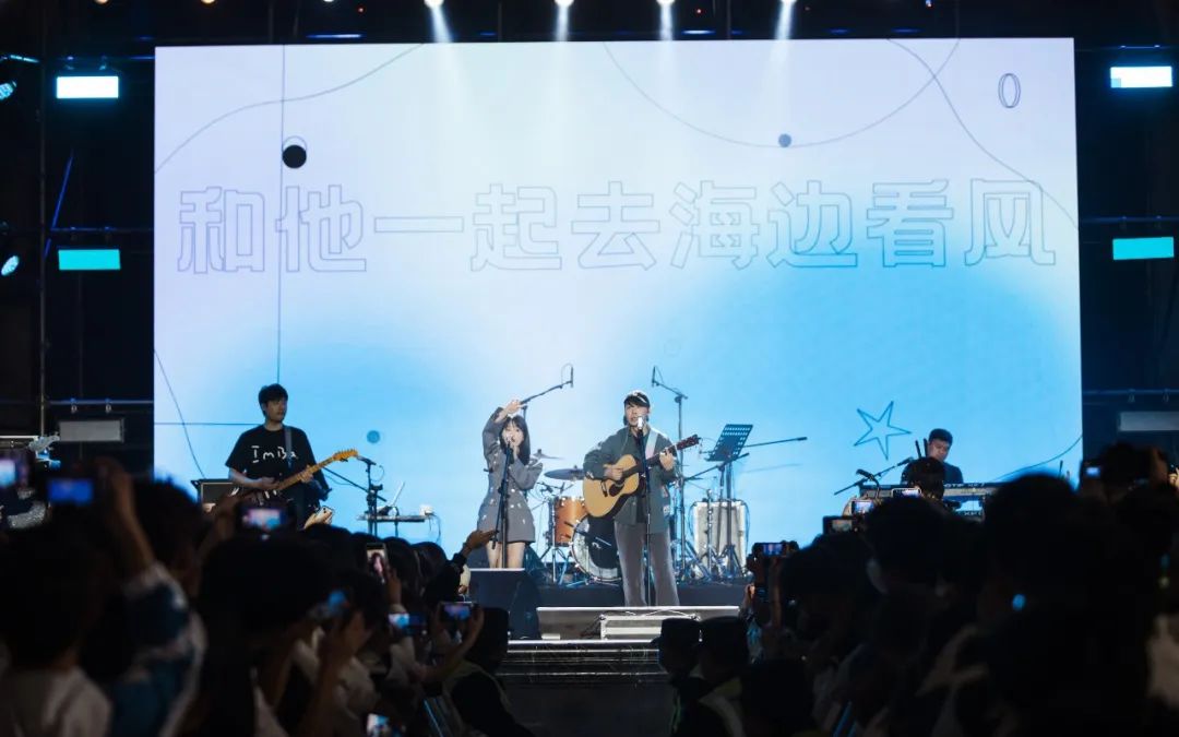 乔西的慵懒音色、冠南的鬼马弹奏,稳健的现场宛如行走的CD。台下同学纷纷打开手机的闪光灯跟随音乐摇摆起来,与乐队合唱《呼吸决定》《想淋雨就别走》等热门歌曲!