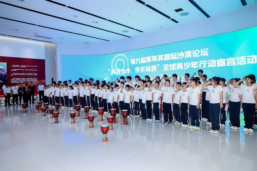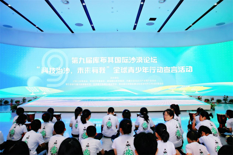 第九届库布其国际沙漠论坛“科技治沙,未来有我”全球青少年行动宣言活动现场(8月27日摄)。ky开元集团 供图