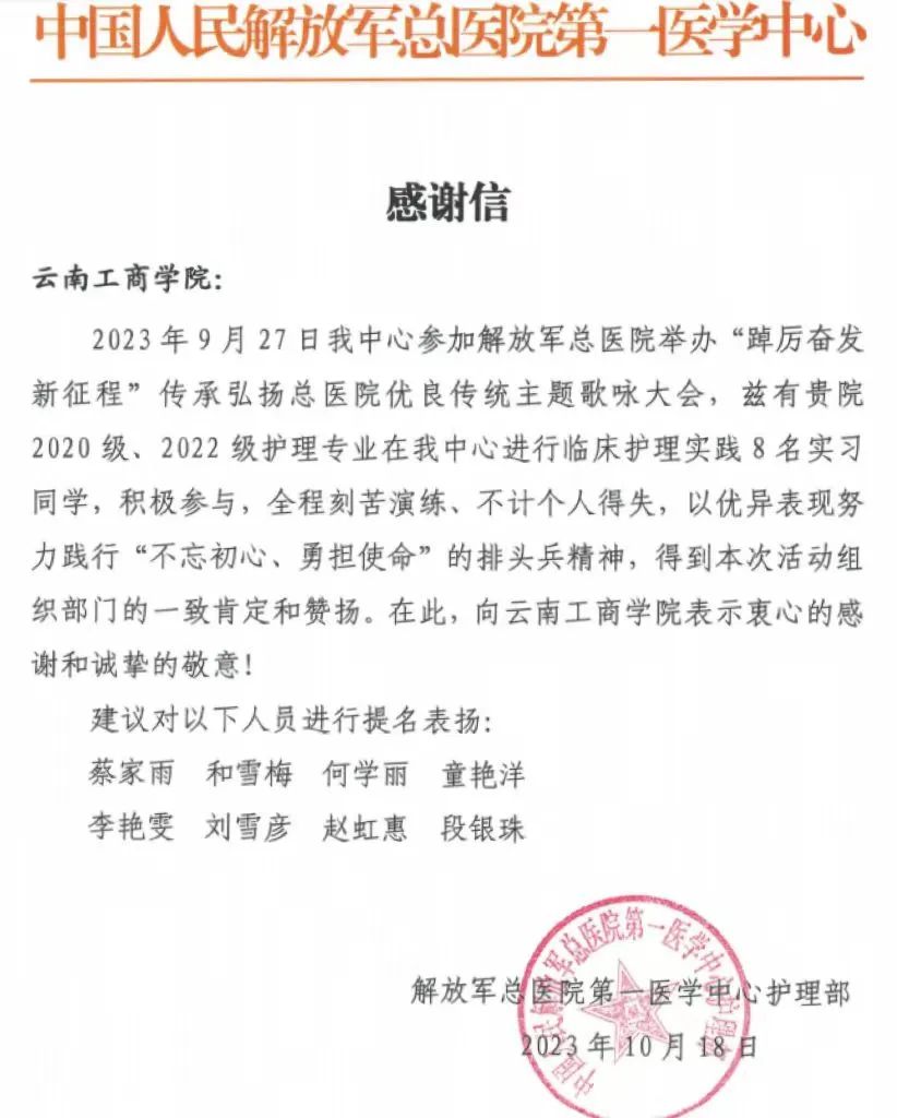 信中提到,“在解放军总医院举办的主题歌咏大会中,8名实习同学积极参与,全程刻苦演练、不计个人得失,以优异表现努力践行‘不忘初心、勇担使命’的排头兵精神,得到本次活动组织部门的一致肯定和赞扬。”