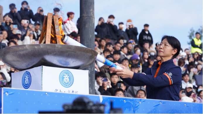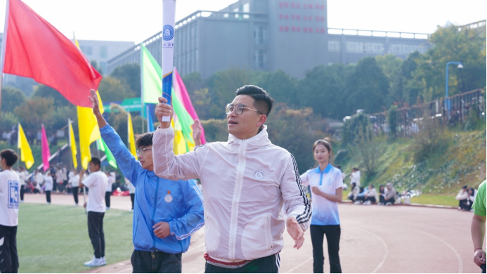象征着体育精神的奥林匹克之火,跟随火炬手,穿越整个校园。学校党委书记李国琼从第三届全国高校教师教学创新大赛二等奖获得者、智能科学与工程学院教师何博手中接过最后一棒,在万众瞩目中点燃了主火炬台。