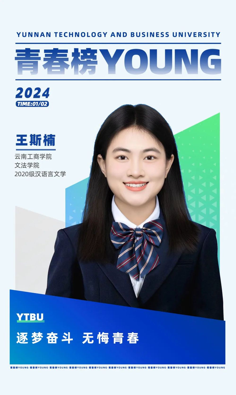 大家好,我是王斯楠,高中毕业于云南普洱景东银生中学。在大学期间,曾荣获“云南省三好学生” “云南省优秀学生干部”等荣誉称号,目前已入职中国农业银行普洱分行。