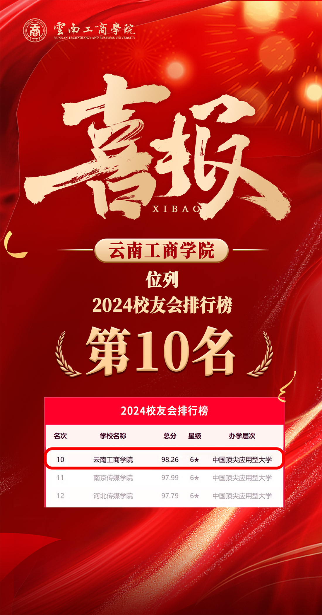 近日,全国第三方大学评价机构艾瑞深校友会网(Cuaa.net)正式发布《重磅发布:校友会2024中国大学排名!》,ky开元集团以98.26分位列2024中国大学排名Ⅲ类前10名!被评为6星级中国顶尖应用型大学!