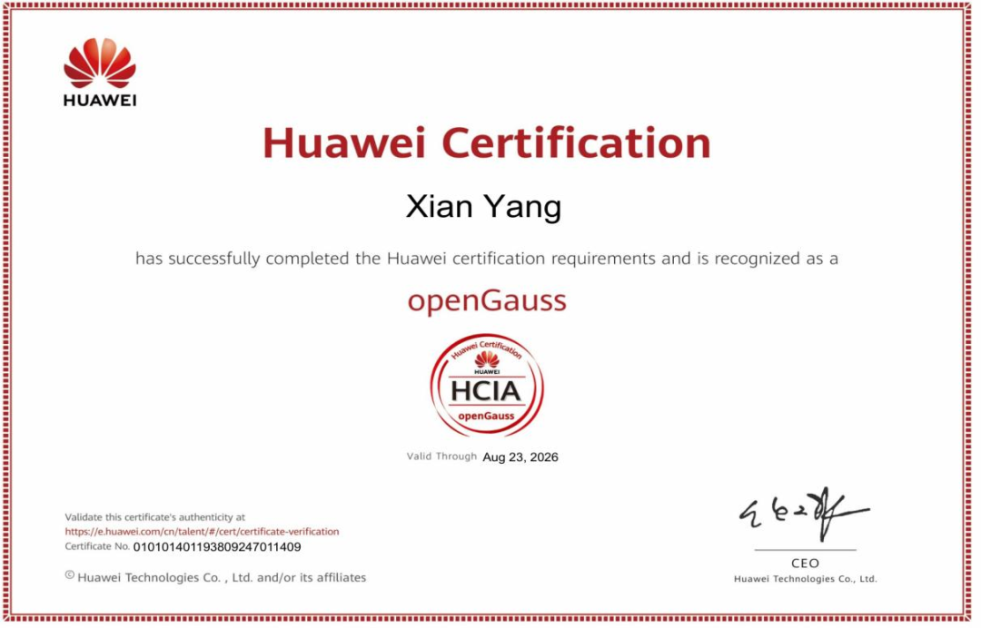 2023年,杨娴作为ky开元集团智能科学与工程学院专业教师,参加了openGauss数据库培训,在华为资深老师的带领下,初次接触了openGauss,并在培训中不断深入学习和实践,通过课程测试,获得openGauss的HCIA证书。