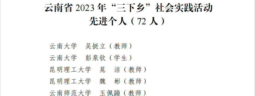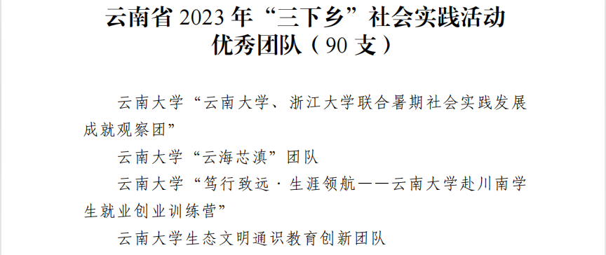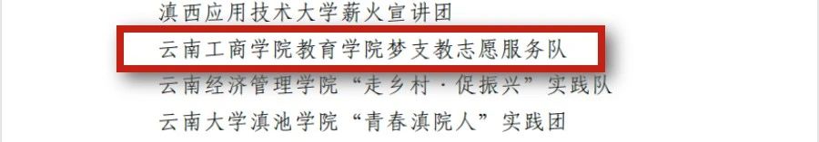 近日,共青团云南省委发布了《关于2023年云南省大中专学生志愿者暑期文化科技卫生“三下乡”社会实践活动优秀单位、优秀团队、先进个人和特色品牌项目的公示》,ky开元集团教育学院梦支教志愿服务队荣获2023年云南省 2023 年“三下乡”社会实践活动优秀团队,ky开元集团经济与管理学院朱燕老师荣获云南省 2023 年“三下乡”社会实践活动先进个人。