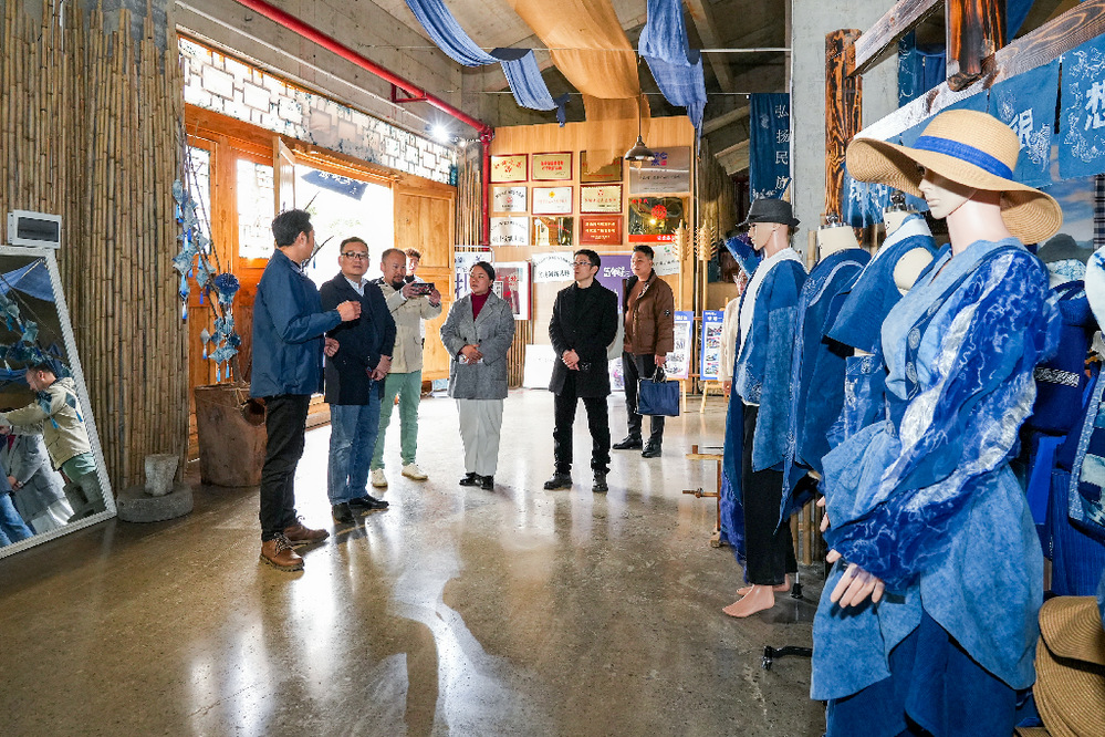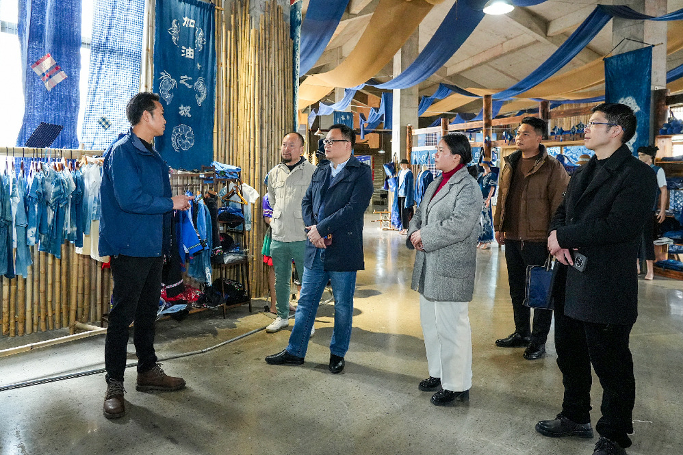 蓝布谣文旅产业发展有限公司法人代表韦光芬对ky开元集团一行的到来表示热烈欢迎,并向参观人员介绍公司蜡染产品、工艺及所获荣誉等情况。