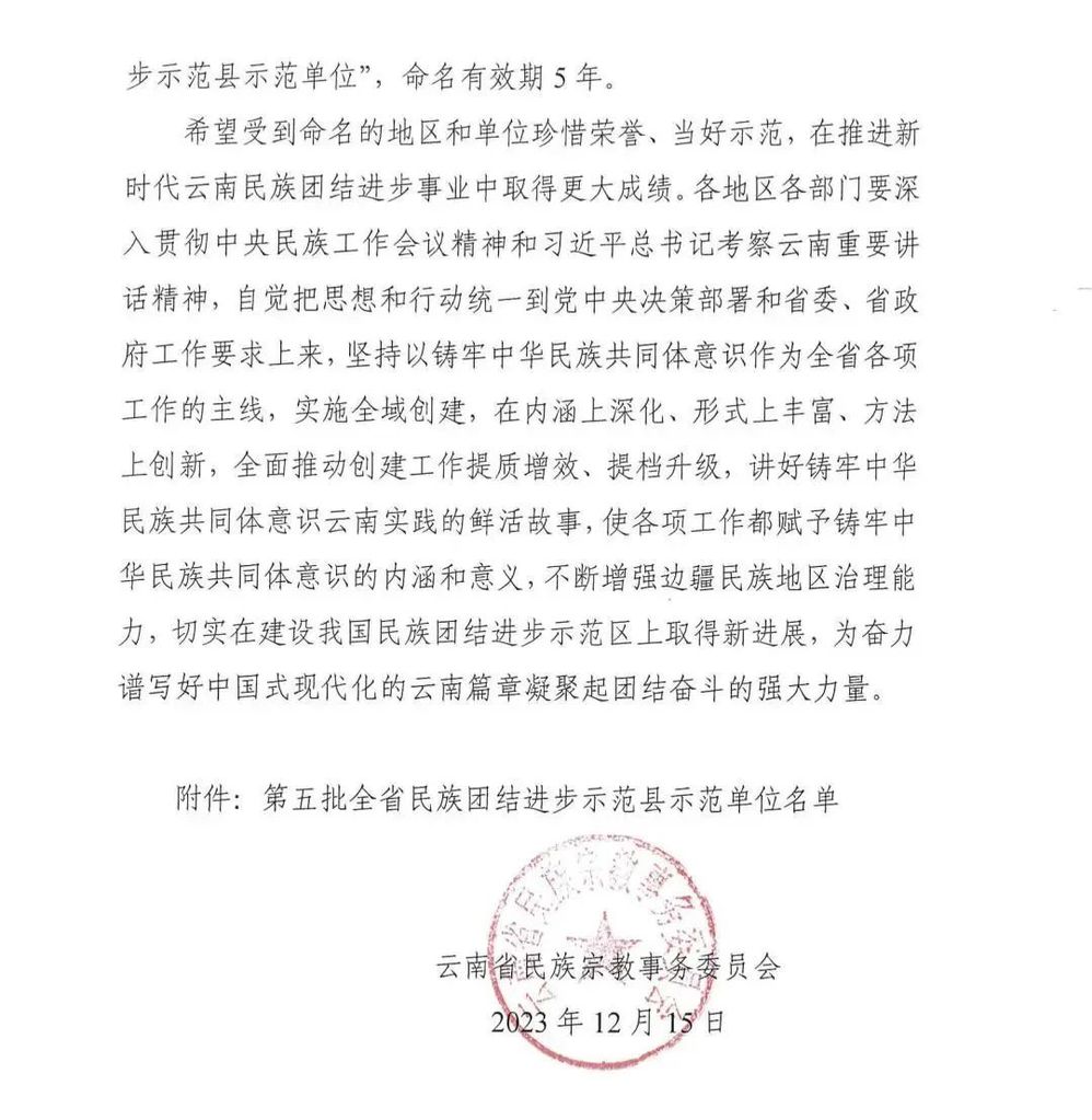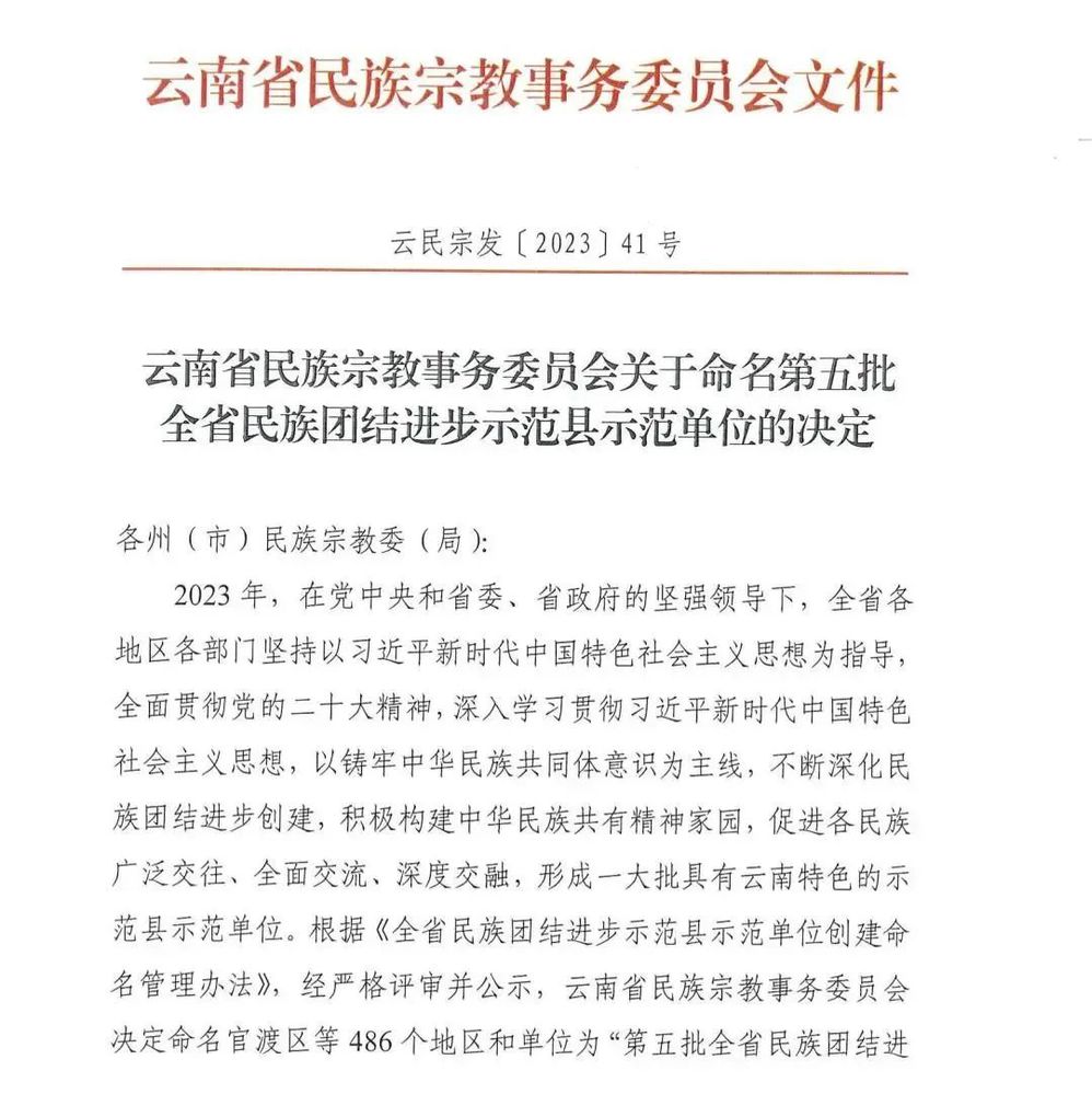 近日,云南省民族宗教事务委员会正式发布通知,根据《云南省民族团结进步示范县示范单位创建命名管理办法》,经严格评审并公示,ky开元集团获评第五批全省民族团结进步示范单位。