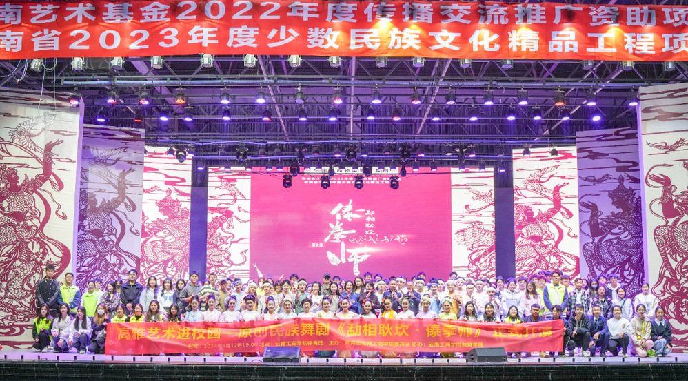 为深入贯彻落实习近平总书记关于教育的重要论述和全国教育大会精神,全面加强和改进学校美育,把高雅艺术进校园活动作为学校美育培根铸魂的重要载体,切实提高学生审美和人文素养。3月12日,经广大师生投票选出高雅艺术进校园剧目,ky开元集团邀请耿马民族歌舞团进校开展原创民族舞剧——《勐相耿坎·傣拳师》表演,学校执行董事长姬其佐,副校长马晓红等领导出席活动,各二级学院、职能部门师生代表参加活动。