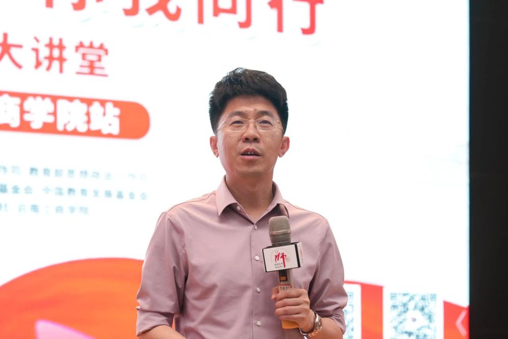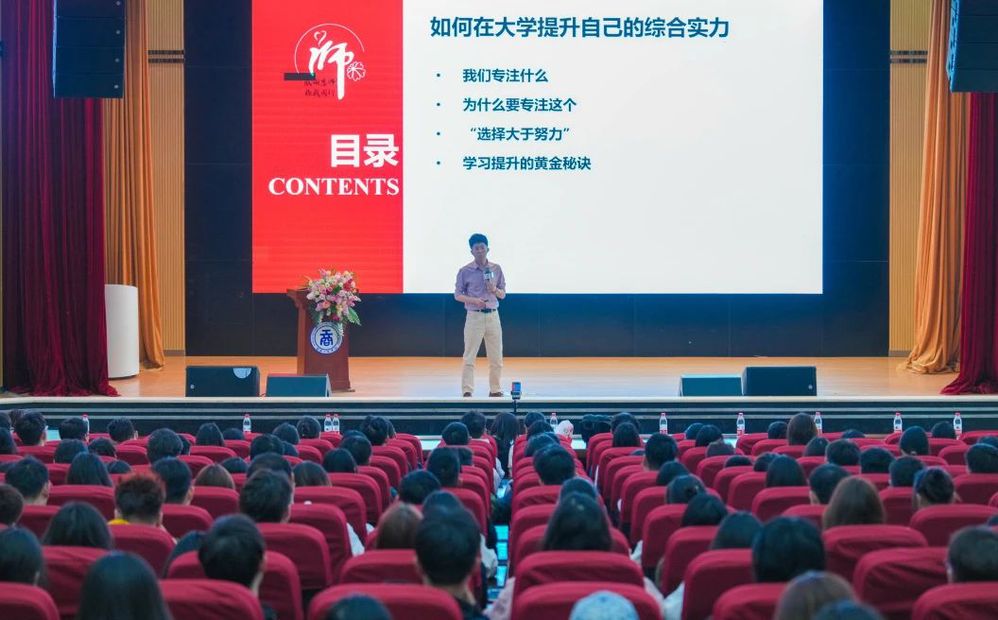 讲座上,甘源结合自身经历和辅导学生的工作经验,幽默风趣地讲述大学生如何在大学提升自己的竞争力,从“需要专注什么”“为什么要专注”“选择大于努力”三方面来宣讲。