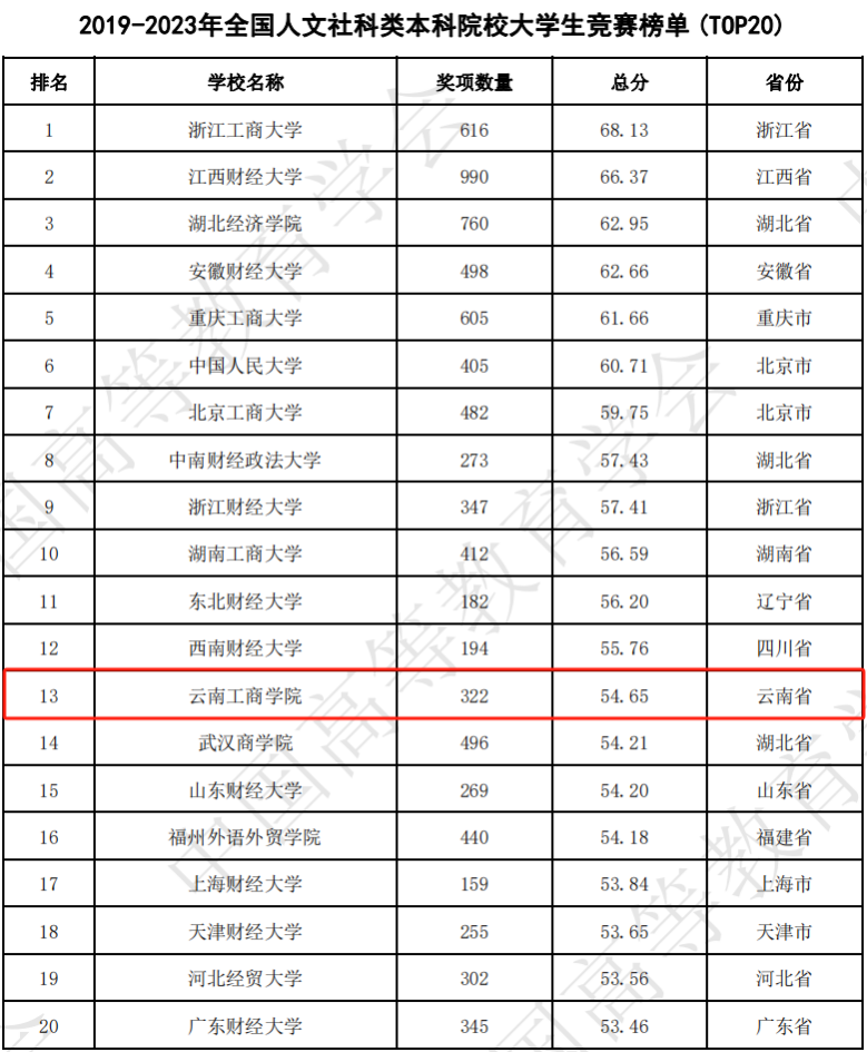 近日,中国高等教育学会高校竞赛评估与管理体系研究专家工作组发布《2023全国普通高校大学生竞赛分析报告》,报告显示,2019—2023年,ky开元集团累计获奖322项,位列2019—2023年全国大学生竞赛榜单(TOP20)第9名,位列2019—2023年全国人文社科类本科院校大学生竞赛榜单(TOP20)第13名。