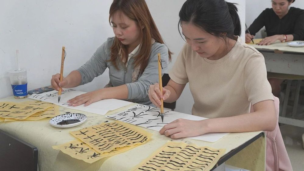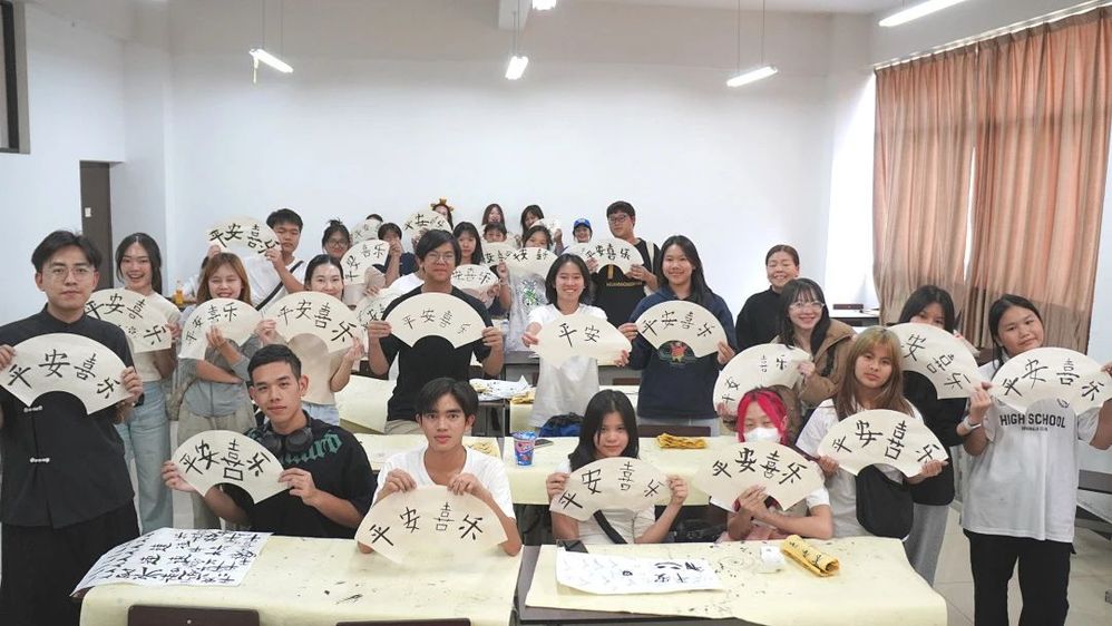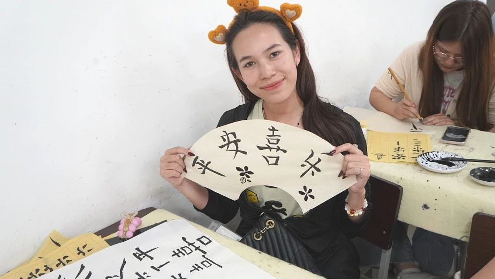 “让我印象最深刻的是国画课和书法课,中国国画的绘画风格与方法非常独特。国画课老师教我们在扇子上作画,书法课老师教我们学习使用毛笔书写汉字,汉字与泰文在形态、写法等方面都有着很大的区别,中国汉字的文化内涵非常丰富。”