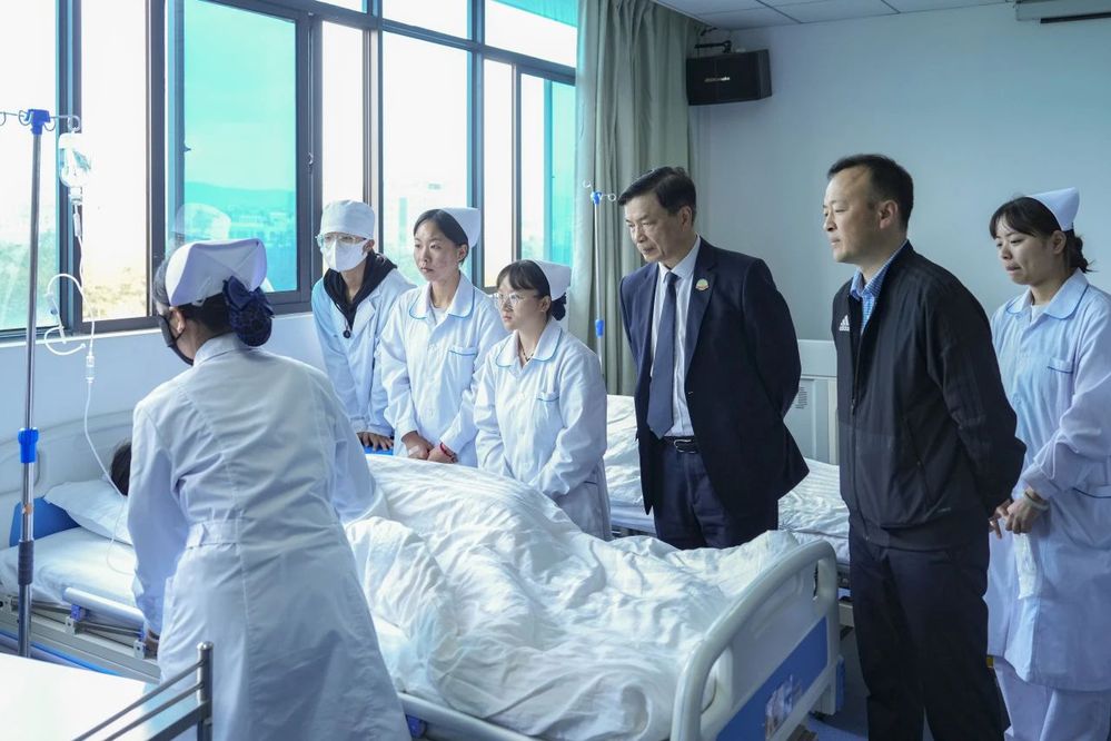唐斌对此次实地参观了解大健康学院学科建设、校企合作、实验实训室建设等成效表示称赞,并对昆明骨科医院人才队伍建设、技术开展、科室设置、科研成效等情况进行了详细介绍。他指出,昆明骨科医院作为云南省目前规模较大、科室设置齐全、诊疗功能完善,集医疗、教学、科研、预防、保健、康复为一体的三级专科医院,对于加深高校与医院的联系,协同发展培育高质量医学类人才十分重视。医院是学校护理生正式转变为专业护士的桥梁,希望通过双方合作,凝聚资源合力,在创新人才培养机制,共育高水平人才队伍、打造产学研人才培养基地等方面深入合作,加强学生综合能力培养,提升临床思维能力,培养更多高素质应用型护理人才,服务地方社会经济。