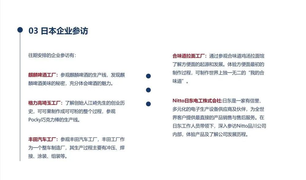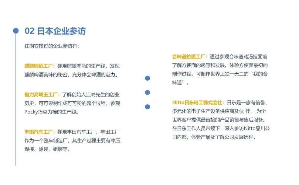 为了让中国大学生有机会在世界一流的名校访学和名企参访,全球知名大学早稻田大学举办「商业与经济」「日语教育与文化」「人工智能与新科技」访学项目。早稻田大学主办部门开设精选课程、举办结业比赛、为每位学员颁发结业证书、教授推荐信,为结业比赛获胜团队颁发优秀学员证明。学员在项目过程中将参与日本百年家族企业、排名第一的教育集团河合塾的实地实习,收获河合塾实习证书、推荐信。